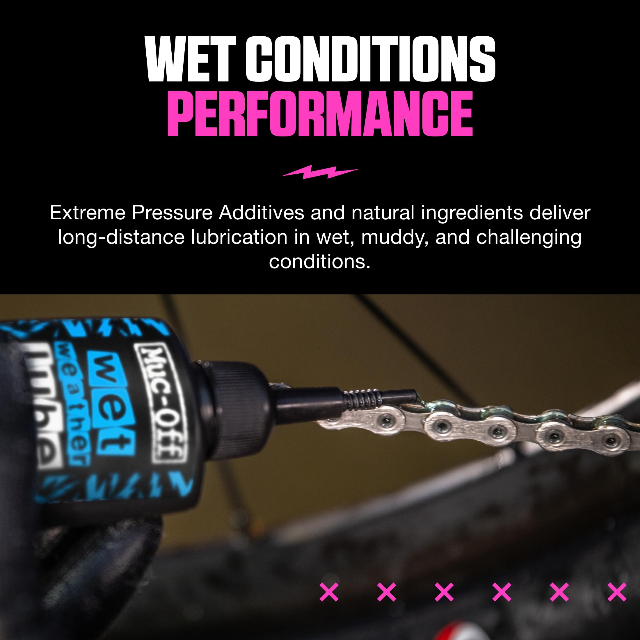 - IDEAL FOR WET WEATHER: Muc-Off's wet bike lube uses a wax-based formula that coats the chain and helps to repel water in wet and muddy conditions. A quick squirt is all you need - simply apply a drop to each link before you ride!