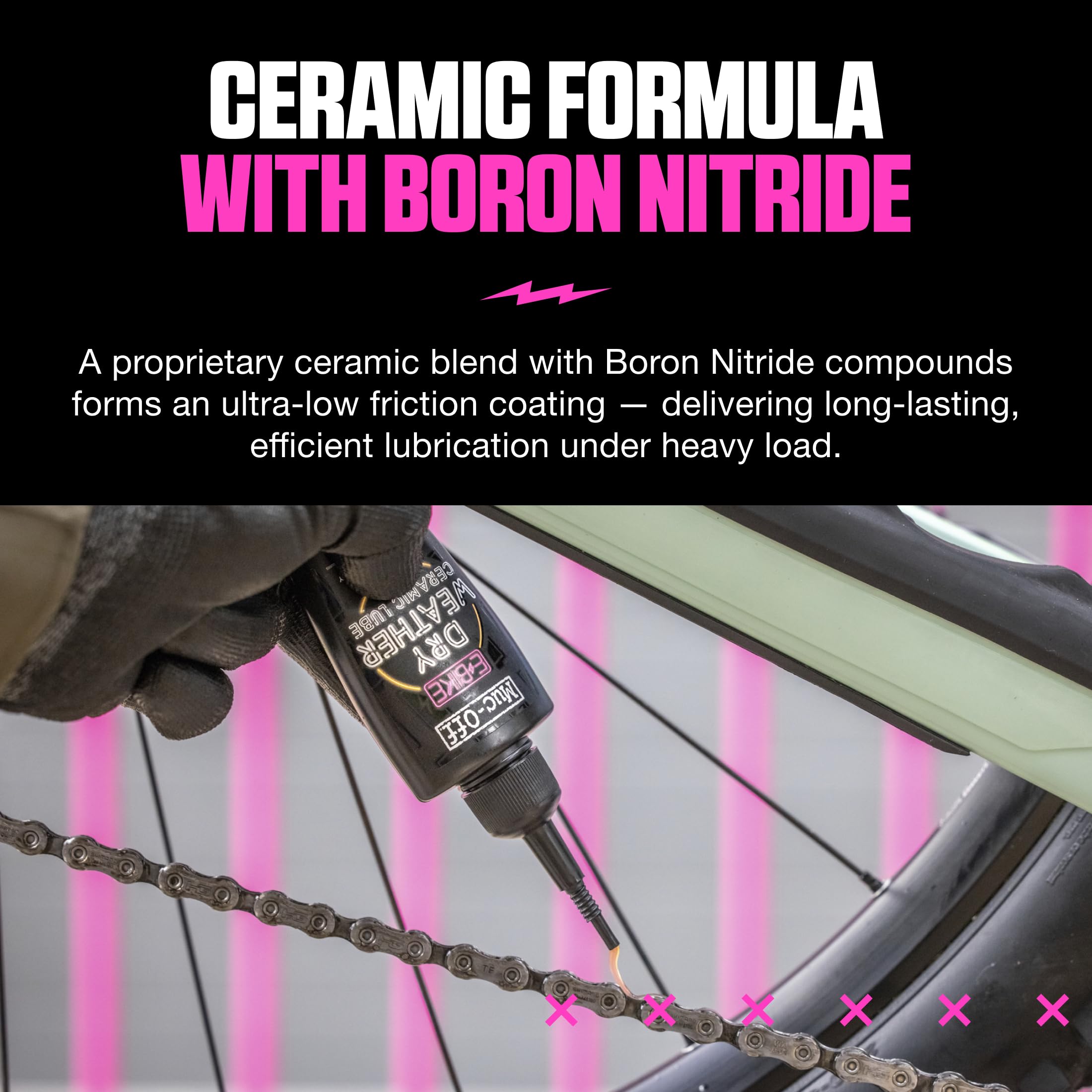 - IDEAL FOR DRY WEATHER: Muc-Off's eBike ceramic chain lube uses a premium formula that coats the chain and helps to eliminate contaminants in dry and dusty conditions. A quick squirt is all you need - simply apply a drop to each link before you ride!